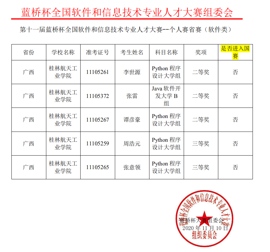 在由工业和信息化部人才交流中心主办的第十一届蓝桥杯全国软件和信息技术专业人才大赛中,公海gh555000aa线路检测中心学子在喜获佳绩,8名参加人员中5名同学获得奖项,产生二等奖3名,三等奖2名。